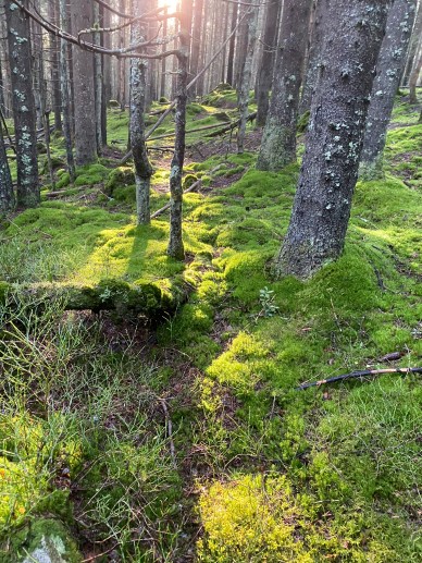 Jeg møtte Gud på tur forge dagen også. Sol som brøt gjennom skyene og løftet humøret flere hakk. Lyset som fant veien mellom trestammene og fikk den grønne mosen til å glitre. Det kobberrøde gresset på myra.